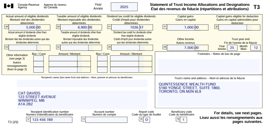 In early March 2026 Cat received a 2025 T3 from Q Wealth that reported eligible dividends, other income (interest), and capital gains. Please see the T3 below: